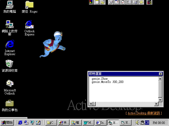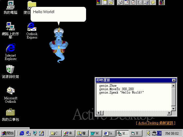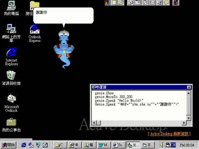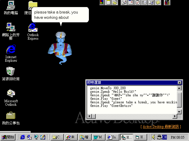 在Agent物件下的Characters是一個群集,使用Characters的Load方法,可以指定載入一個.ACS的演員檔案,並建立一個以第一個參數命名的Character物件。不過在Agent的物件類別名稱中,Character的類別名稱是IAgentCtlCharacter,所以如果要宣告一個物件來承接這個Character物件,則必須將物件的類別宣告為IAgentCtlCharacter類別。取得Character物件之後,便可以控制他的一舉一動了。上面的範例中,使用的是Genie.acs檔案,所以呼叫出來的是阿拉丁神燈中的精靈。(如圖9)